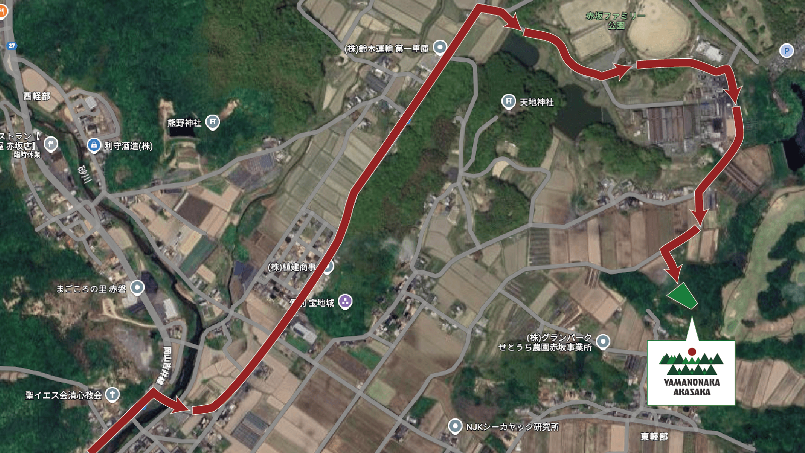 GoogleMapで検索すると狭く危険なルートを案内されるため、必ず以下ルートをご利用ください。